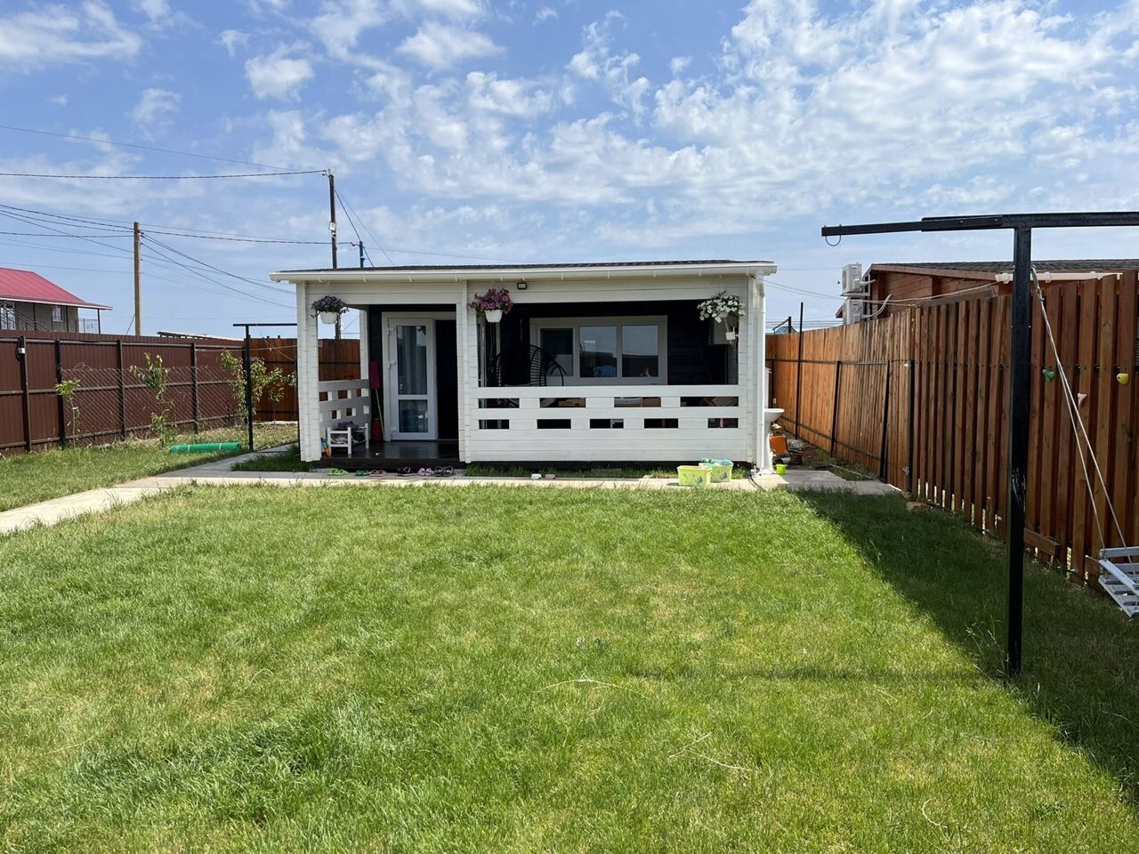На территории газонная рулонная трава с автополивом, мангал, скалодром, детские качели, стиральная машина.