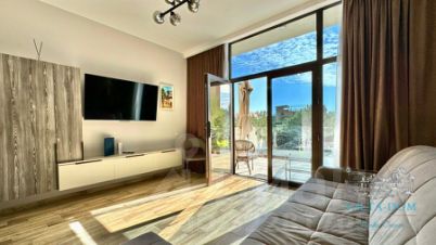 Первый этаж холл, гостиная с раскладным диваном, санузел. Из гостиной, выход на открытую террасу с зонтиками и мебелью для завтраков на открытом воздухе. Кухня с посудомоечной машинкой, TV и всем необходимым.