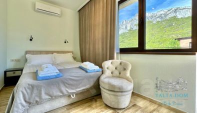 Второй этаж - большая спальня с двуспальной кроватью; вторая спальня с двуспальной кроватью. В каждой комнате, кондиционеры, TV; из одной спальни выход на открытый балкон с летней мебелью и видом на горы.