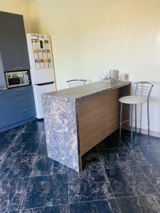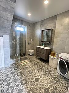 Двух этажный коттедж - на первом этаже по всей площади водяной теплый пол, сан узел со стиральной машиной, гардеробная, гладильная доска, утюг, большая гостинная с оборудованной кухней, вся необходимая посуда в наличии, бытовая техника (плита, холодильник, микроволновая печь, электрический чайник), кондиционер.