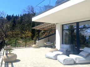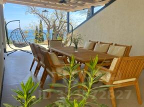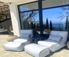 На втором этаже: коридор, раскладное кресло-кровать, две изолированные спальни с выходом на балкон с летней мебелью и видом на море. На балконах - стильные стулья с удобными подушечками и стол.