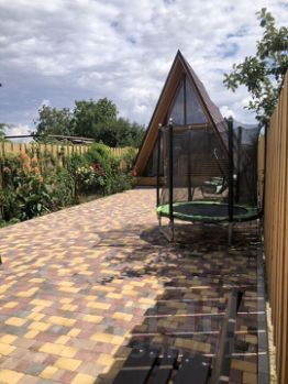 Каждый домик имеет зону отдыха с качелями.