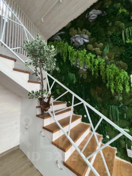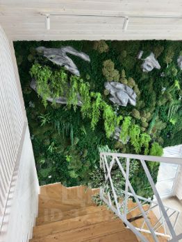 В этом интерьере царит удивительная гармония природы и современного дизайна. Центральным акцентом служит роскошная зелёная стена с имитацией лесного пейзажа — густые мхи, изящные лианы, миниатюрные деревца и стилизованные камни создают ощущение погружения в миниатюрный природный мир прямо внутри дома. Эта живая композиция наполняет пространство свежестью и умиротворением, превращая обычную лестницу в элемент сказочного ландшафта.