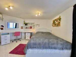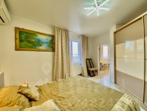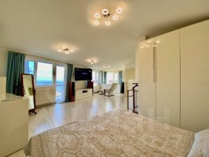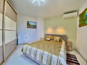 -3-я спальня: двуспальная кровать, светильники, кондиционер, шкаф, вешалки, зеркало, тумбы, Smart телевизор, домашний кинотеатр, кресло, выход на балкон