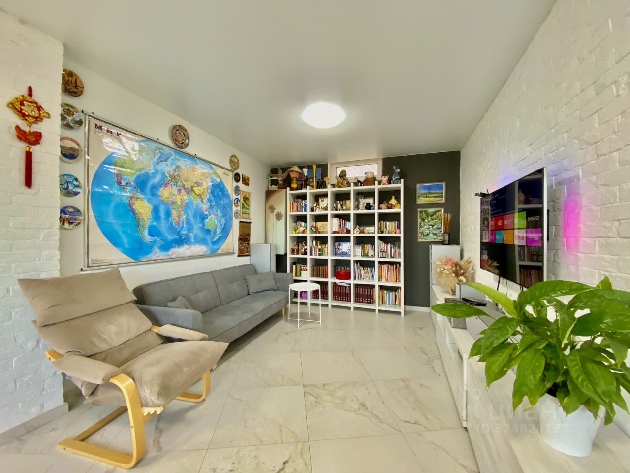 -Гостиная: обеденный стол, стулья, раскладной диван, кресло, Smart телевизор, книжный шкаф, выход на балкон