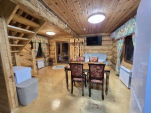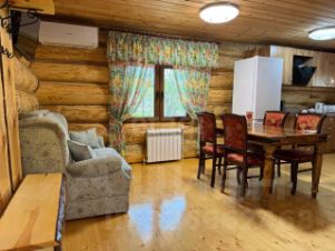 На 1 этаже: в кухне-гостиной есть 1,5 местный раскладной диван, телевизор, вай-фай, отдельная кухонная зона с холодильником, индукционной плитой, микроволновкой, обеденным столом, плюс есть вся необходимая посуда, стиральная машина, кондиционер, туалет: душевая кабина и т.д., веранда.
