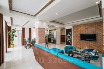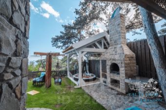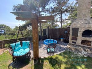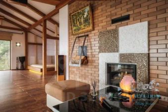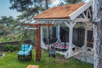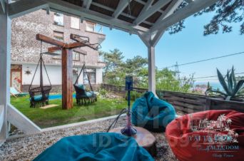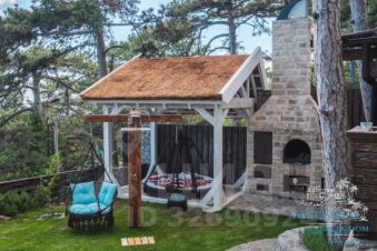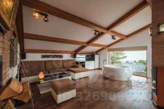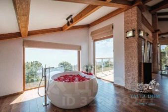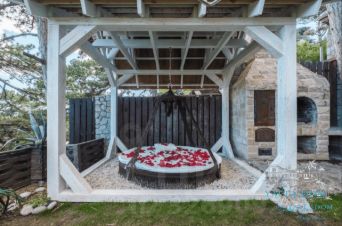 Третий этаж — огромная дизайнерская спальня с круглой ванной и панорамным видом на море. Камин на дровах и выход на террасу с прекрасным видом на море, горы, сосны; санузел (туалет, душ). Профессиональный проектор и стереосистема, караоке.