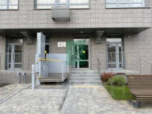 -Первый этаж в крупном ЖК. Два отдельных входа с фасада и торца здания. Оборудован пандус и подъемник для маломобильных групп населения.