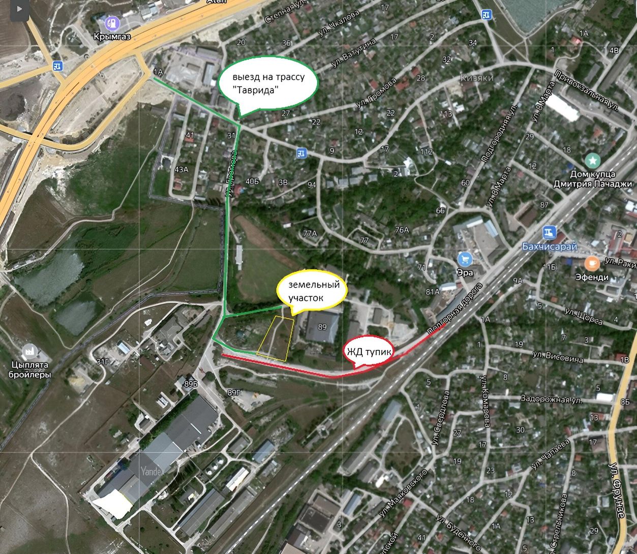 На границе земельного участка действующий тупик протяженностью 500м, примыкающий к железнодорожной станция Бахчисарай.