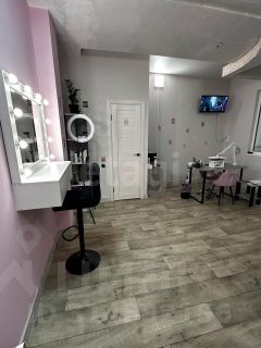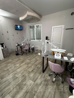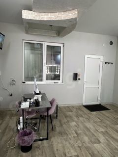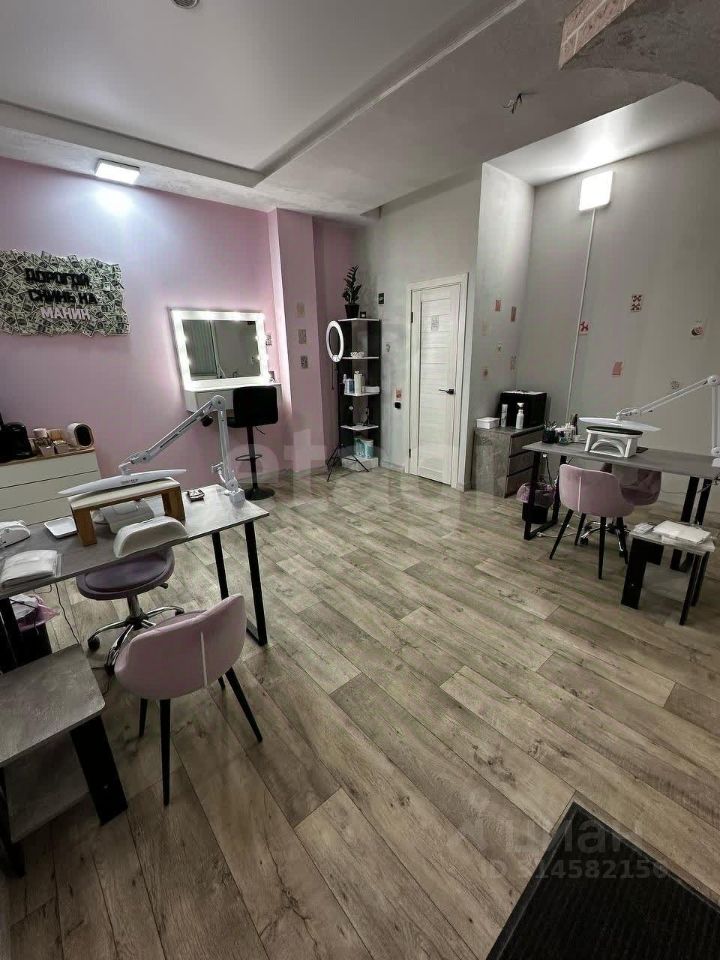 Пустое помещение, вода и свет есть, стеклянные двери, есть отдельное помещение с санузлом и раковиной, положен плинтус на пол, покрашеные стены в бело-розовый цвет, видное место, мебель остается по договорености.
