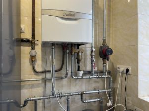 Коммуникации: Центральные водопровод и канализация. Электричество 15 кВт. Газ. Установлен двухконтурный газовый котел. Установлена система теплых полов.