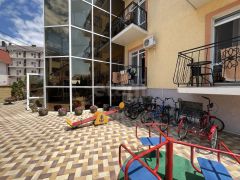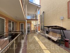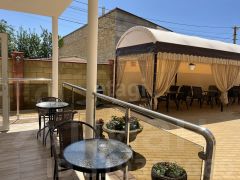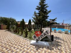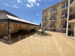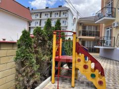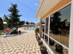 Территория гостиницы ухожена: двор вымощен плиткой, оборудованы зоны для отдыха, фонтан, крытые площадки, мангальная зона, бассейн с шезлонгами и детская площадка с батутом, что создает комфортные условия для гостей разного возраста.