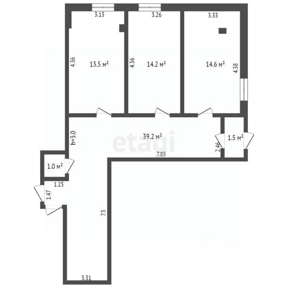 Объект состоит из трех изолированных помещений площадью 14,6 кв.м., 14,2 кв.м. и 13,5 кв.м., а также просторного коридора 39,2 кв.м., что позволяет гибко организовать пространство под различные нужды