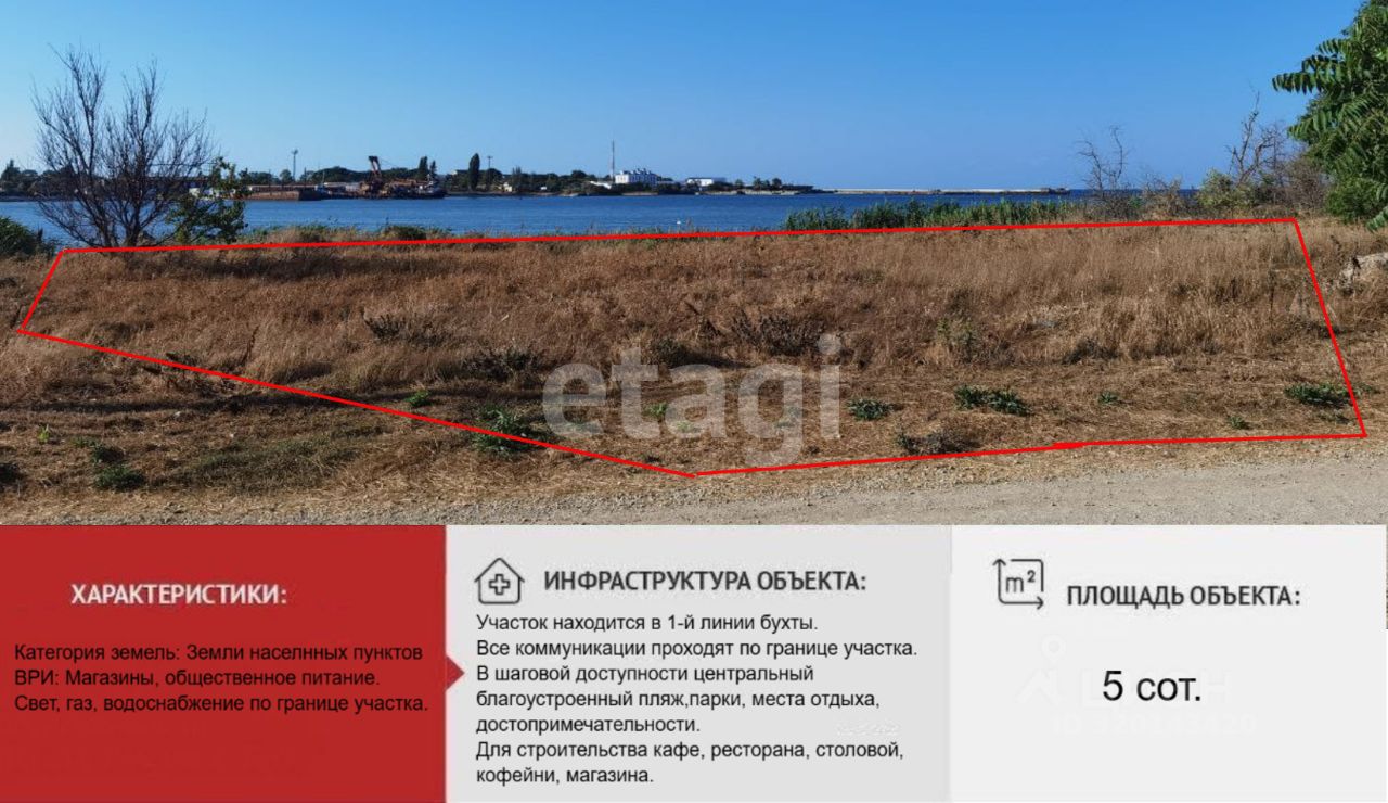 Разрешенные виды использования: Магазины. Общественное питание. Участок находится в 1-й линии бухты. Участок ровный, пологий песчаный спуск к воде. Все коммуникации проходят по границе ( электричество, газ, центральное водоснабжение). Идеальное место для строительства кафе, ресторана, столовой, кофейни, магазина.