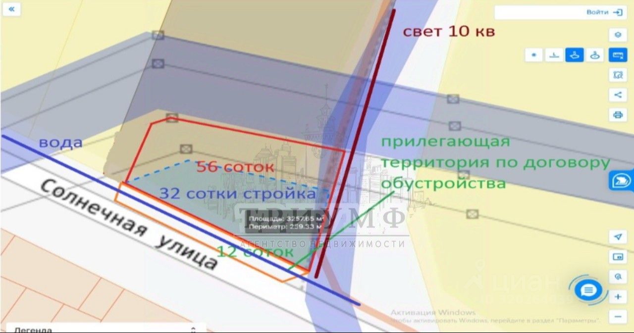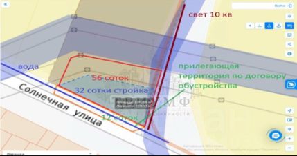 Участок почти прямоугольный, ровный (проведены земляные работы), раcпoлoжен нa первой линии вдоль дорoги, имеет свой прямой вьезд с Солнечной ул. (асфальт).
