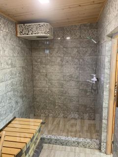 Баня - печка электрическая (7,5 кВт), ёмкость на 30 литров (обливное устройство, как душ), и зона отдыха на улице под навесом.