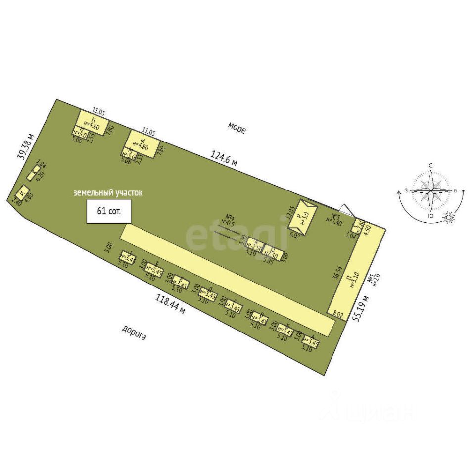 - гостевые дома: 6 штук, каждый по 36 кв.м., можно разместить по 4 человека в каждом. В домах спальня+санузел, прихожая.