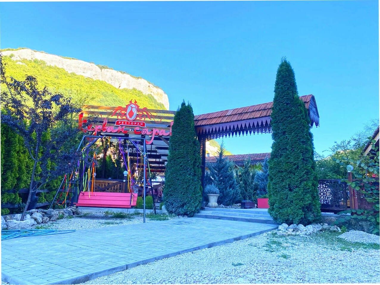 Кафе расположено у центрального входа в пещерный город-крепость Мангуп-Кале, столицу средневекового княжества Феодоро, непосредственно на берегу Мангупского озера.