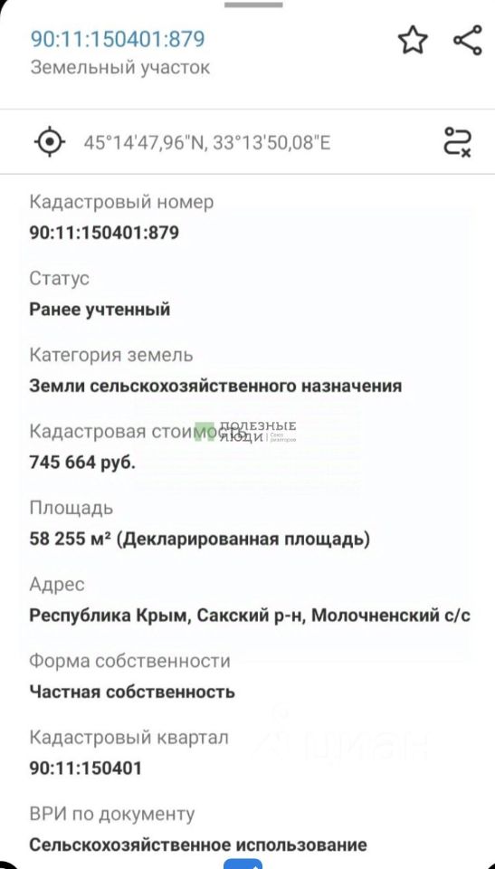 Цена указана за весь участок. Продается 5.8 га земли сельхозяйственного назначения. Вид разрешенного использования:сельскохозяйственное использование. Плодородная земля с отличными подъездными путями. Часть участка граничит с трассой Евпатория-Мирный на повороте к с.Молочное и Витино.