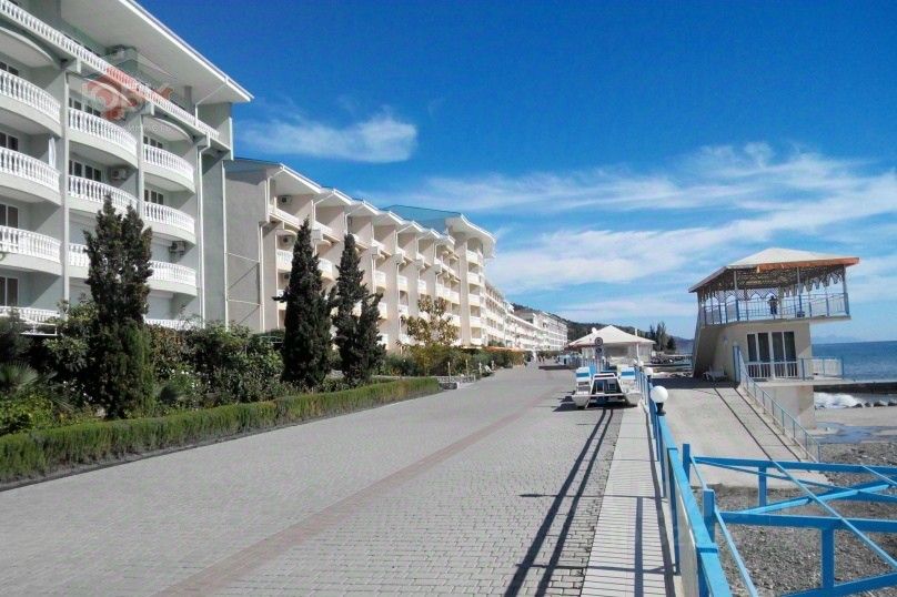 Гостиница расположена на самом берегу Черного моря, рядом растут кипарисы и можжевельники, есть парковая зона Семидворье.