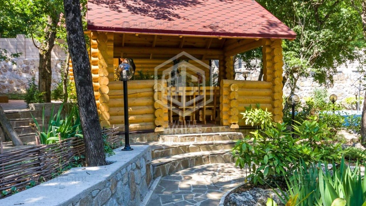 Арт. 120533172 Код объекта: 1683253. Продается готовый бизнес! Усадьба "Медведь" располагается среди гор и лесов, в живописном поселке Виноградное, в 10 км от центра Ялты - это 5 домиков из сруба на территории усадьбы. Высокие потолки в 3,5 м. Также на закрытой охраняемой территории располагаются: ресторан, бассейн, беседки с мангалом, сауна и тихая уютная лесная зона отдыха. На участке в 30 соток произрастают хвойные породы, экзотические растения (агава, пальма и т.д.), также высажены яблоня, инжир, груша, слива, алыча, шелковица, орех, хурма. Оборудован автополив. Участок имеет закрытую территорию, ограждён забором с коваными воротами. На въезде во двор большая открытая площадка, на которой можно припарковать машины. Обладает прекрасными видовыми характеристиками, большие открытые террасы, удобное размещение гостей, а также может использоваться для получения дохода со сдачи в аренду. В шаговой доступности от усадьбы расположена автобусная остановка, откуда можно доехать до центра города, до автовокзала Ялты и водопада Учан-Су. Водопад является самым высоким в Крыму, он расположился в окружении крутых гор и хвойных лесов, на высоте 390 м над уровнем моря.