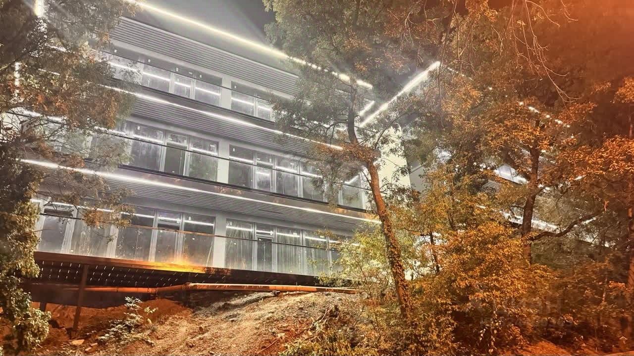Здание отличается завершенными фасадными работами и архитектурной подсветкой, подчеркивающей его современный стиль.