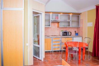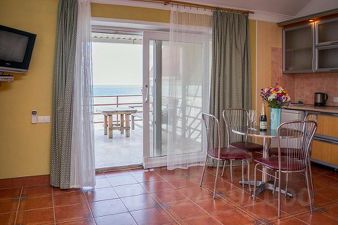 1-Й ЭТАЖ - двухкомнатный номер, который имеет свою террасу, и два выхода с разных сторон эллинга -в сторону пляжа и на улицу с тыльной стороны. Номер оснащен абсолютно всем необходимым для комфортного проживания и состоит из гостиной, спальни, кухни, санузла.