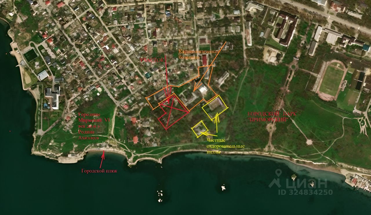 на условиях аренды у Администрации города. Разрешенное использование Санаторная деятельность, что позволяет строить виллу с функцией оздоровления. Рядом расположены две частные виллы с функциями оздоровления. Владелец имущественного комплекса частное лицо. Возможные варианты использования: Частные резиденции с назначением санаторная деятельность общеоздоровительного назначения (Превентивная медицина разрешенный вид деятельности); Медицинская деятельность; санаторная деятельность; дом престарелых ВИП назначения. На соседнем участке городская кардиологическая больница. До моря и городского пляжа 100 метров. На соседнем участке большой городской парк на берегу моря. На соседнем участке древнее городище 6 века до нашей эры Мермикий. Родина Ахиллеса. Керчь входит в десятку древнейших городов мира. Возраст 2625 лет.
