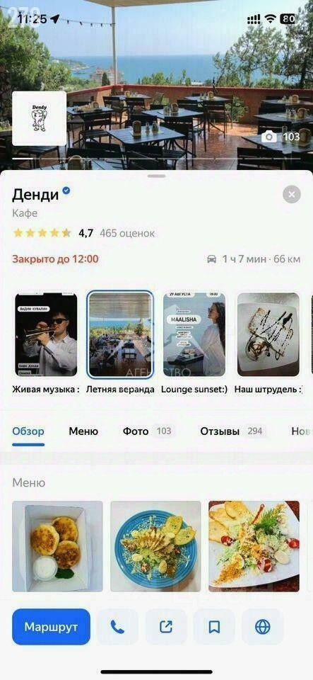 Отличный рейтинг на Яндексе, работаем почти 30 лет. Кафе расположено в живописнейшем районе Крыма,прекрасные виды с его террас обеспечено в любое время дня и любое время года .
