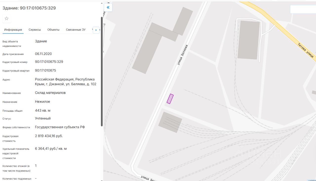 нежилое здание (склад материалов) площадью 443,0 кв. м, кадастровый номер 90:17:010675:329, расположенное по адресу: Российская Федерация, Республика Крым, г. Джанкой, ул. Беляева, д. 102.