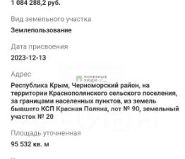 Выставлен на продажу участок плодородной земли площадью 9.5 гектар. Участок находится вблизи села Красная поляна, 50 км от Евпатории и в 20 км от пгт. Черноморское. Участок угловой и имеет хорошие подъездные пути. Земли плодородные. Есть возможность выкупить смежный участок, тем самым увеличить угодья в два раза.
