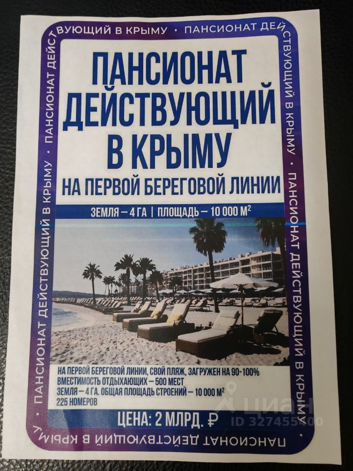 Продается право собственности на земельный участок (коммерческого назначение: Санаторная деятельность) со зданиями, домами, гостиницей и сооружениями, общей площадью около 40 000 квадратных метров, расположенный в уникальной локации между знаменитым Сакским, грязевым озером и собственным ПЕСЧЯНЫМ пляжем на побережье Чёрного моря, примыкающим прямо к территории прекрасного пансионата "Солнечный берег". Цена за объект посчитана исходя из 10-ти летней окупаемости деятельности Пансионата, БЕЗ УЧЁТА возможности КРАТНО увеличить площадь зданий и количество отдыхающих тут гостей. Лечебный, комфортный (!!!), морской воздух и температура создаёт все условия для постоянных гостей отдыхать летом именно в Саки в то время, когда на ЮБК летом наступает знойная жара и влажность. Именно поэтому данный Пансионат из года в год принимает всё больше гостей со всей России и готов к расширению и росту числа приезжающих вылечить организмы и отдохнуть.