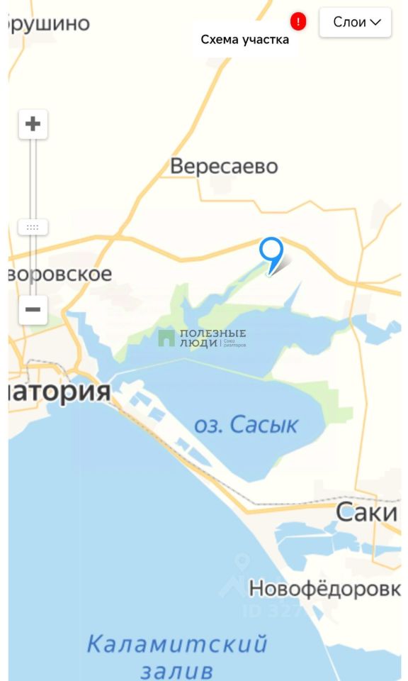 Суворовское ( розовое озеро 900м, море 10 км., Евпатория 10 км., Саки 10 км., неглубокое залегание воды 30-40м. полуостров заселен лебедями, дорога с выделением на кадастровой карте)