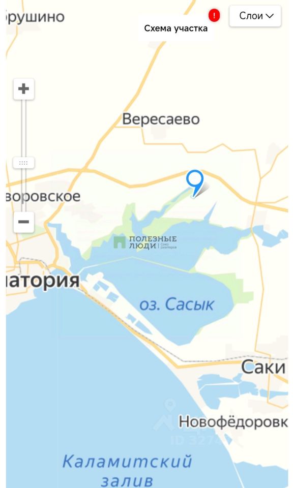 Суворовское ( розовое озеро 900м, море 10 км., Евпатория 10 км., Саки 10 км., неглубокое залегание воды 30-40м. полуостров заселен лебедями, дорога с выделением на кадастровой карте)