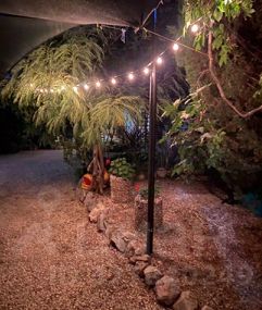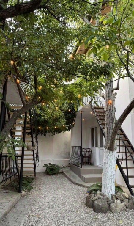 Весь двор утопает в зелени, засажен экзотическими деревьями и большими кипарисами.