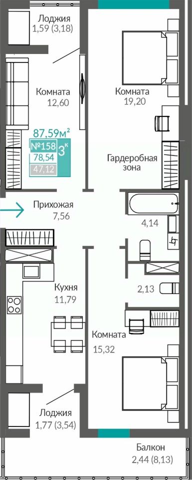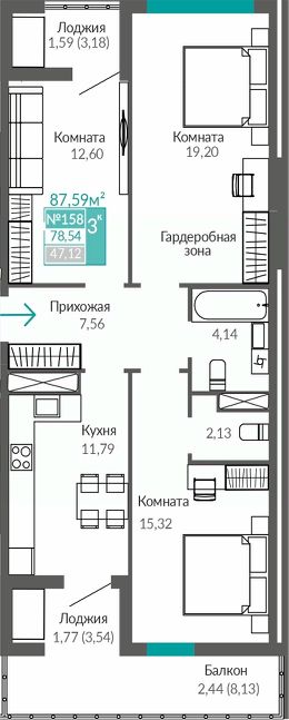 Продаётся 3-комнатная квартира в строящемся доме (С7), срок сдачи: III-кв. 2027, общей площадью 78.54 кв.м., на 5 этаже. Жилой квартал "Абрикос" - начало яркой истории жизни в прогрессивном районе Симферополя - Семья городских кварталов "Крымская Роза".