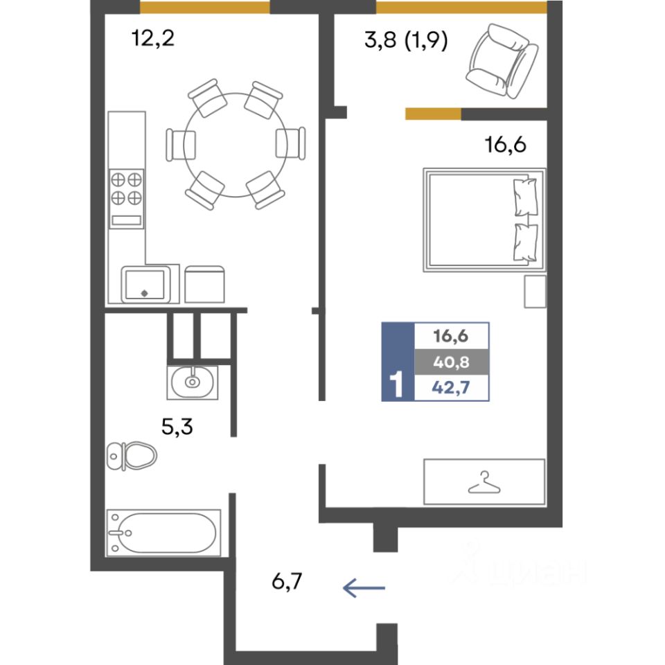 Общая площадь42,7 м²
