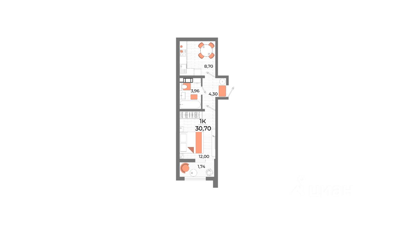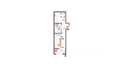 Oбщaя площадь: 30,7 кв.м.