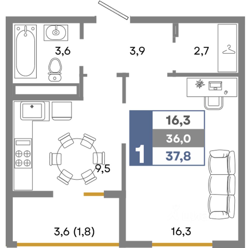 Общая площадь37,8 м²