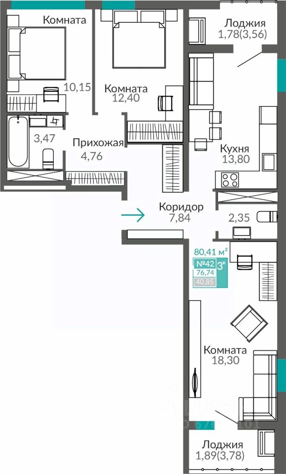 Общая площадь76,74 м²