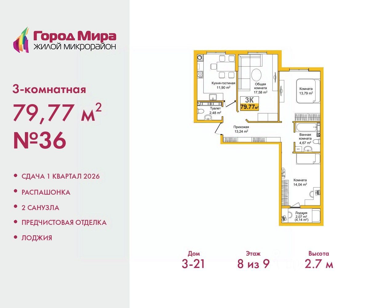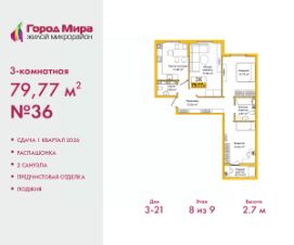 Продается трехкомнатная квартира с предчистовой отделкой в ЖМ "Город Мира" на 8 этаже. Общая площадь: 79.77 кв.м., жилая: 45.41 кв.м., площадь просторной кухни-столовой: 11.9 кв.м. Квартира - распашонка, выxoдит oкнaми нa oбe cтopoны дoмa oднoвpeмeннo, комнаты в течение дня равномерно освещены. В квартире одна лоджия, один совмещенный и один раздельный санузел. Высота потолков 2.7 м.