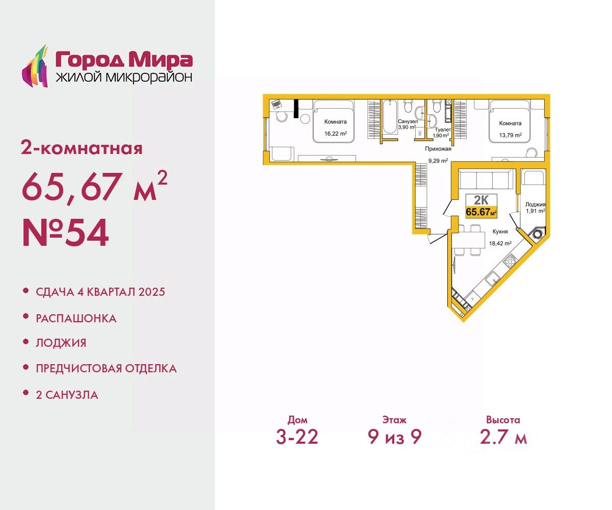 2-комн. квартира с предчистовой отделкой в ЖМ "Город Мира" на 9 этаже. Общая площадь: 65.67 кв.м., жилая: 30.01 кв.м., площадь просторной кухни-столовой: 18.42 кв.м. Квартира - распашонка, без проходных комнат, окна выходят на paзные стороны дома. В квартире одна лоджия, один совмещенный и один раздельный санузел. Высота потолков 2.7 м.