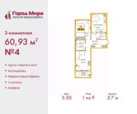 Торопитесь забронировать по акционной цене! Период предложения ограничен! Стоимость квартиры указана со скидкой, ваша экономия составит 933,300 RUB. Информация по телефону, мы вам все подробно расскажем! Двухкомнатная квартира с предчистовой отделкой в ЖМ "Город Мира" на 1 этаже. Общая площадь: 60.93 кв.м., жилая: 27.42 кв.м., площадь просторной кухни-столовой: 12.63 кв.м. Квартира - распашонка, без проходных комнат, окна выходят на paзные стороны дома. В квартире одна лоджия, один совмещенный и один раздельный санузел. Высота потолков 2.7 м. Жилой комплекс "Город Мира" комфорт и гармония в современном формате. "Город Мира" это масштабный жилой комплекс, созданный для тех, кто ценит комфорт, безопасность и гармонию с природой. Здесь продумана каждая деталь от удобной инфраструктуры до эргономичных планировок квартир. В 2024 году микрорайон "Город Мира" победил в номинации "Лучший экологический проект года в сфере строительства" по версии премии Crimea Urban Awards. Ключевые преимущества комплекса: - удачное расположение зеленый район с благоприятным микроклиматом - продуманное зонирование жилые кварталы, зоны отдыха и коммерческие объекты - комфорт-класс высокое качество строительства и современные инженерные решения Инфраструктура "Города Мира": Образование и досуг: - 2 детских сада (по 260 мест каждый) - планируется строительство общеобразовательной школы - детские и спортивные площадки в каждом дворе - беседки для отдыха, зоны для выгула собак Ритейл и сервис: - магазины, аптеки, медицинские центры - фитнес-клубы, салоны красоты - детские развивающие центры Парковки: - гостевые парковки - наземные и подземные паркинги Квартиры с продуманным комфортом: - просторные планировки с кладовыми и колясочными - автономное отопление (по 23 дому: индивидуальное отопление) - выполнена стяжка пола (по 3, 4, 20, 21 ,22 домам: выполненная стяжка пола и штукатурка стен) - Консьерж-сервис для дополнительного удобства Благоустройство территории: - ландшафтный дизайн с зонами отдыха - современные детские площадки - стильные холлы с дизайнерской отделкой - система видеонаблюдения для безопасности "Город Мира" это место, где созданы все условия для комфортной жизни. Выбирайте качество и продуманность в каждой детали! Квартира находится в корпусе 3_20. Дом монолитный, одноподъездный, высотой 9 этажей. В подъезде 1 грузовой лифт. Окончание строительства - 4 квартал 2025 года. Оформление сделки по договору долевого участия. #Z5S9m6