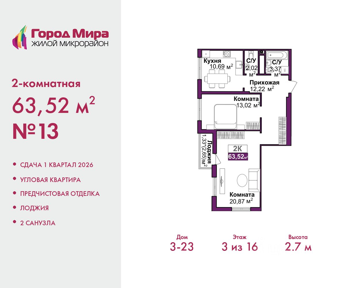 Продается 2-комн. квартира с предчистовой отделкой в ЖМ "Город Мира" на 3 этаже. Общая площадь: 63.52 кв.м., жилая: 33.89 кв.м., площадь просторной кухни-столовой: 10.69 кв.м. Угловая квартира, очень светлая, естественная вентиляция при открытии окон. В квартире одна лоджия, один совмещенный и один раздельный санузел. Высота потолков 2.7 м.