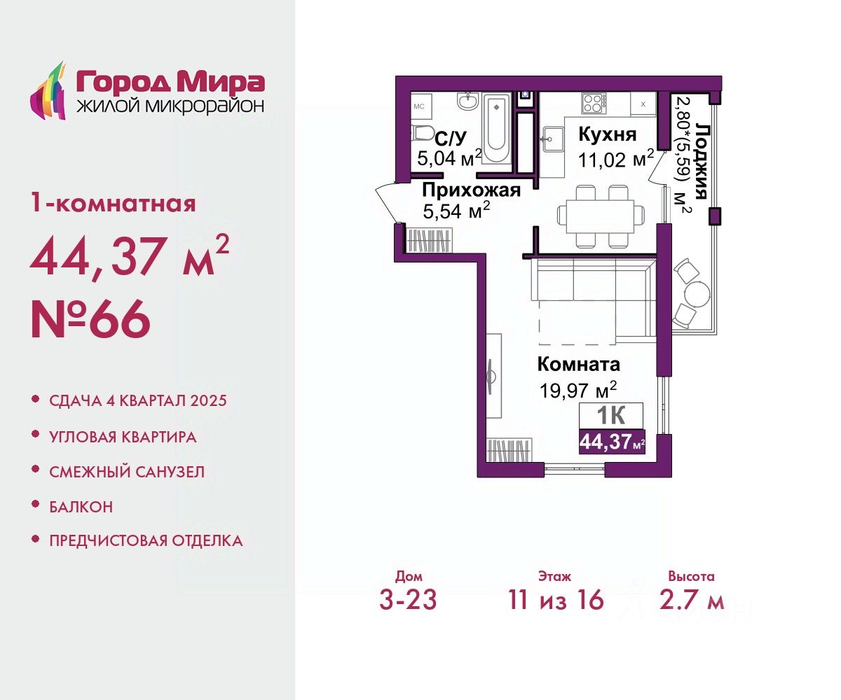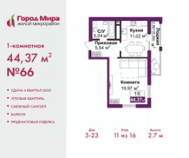 Продается 1-комн. квартира с предчистовой отделкой в ЖМ "Город Мира" на 11 этаже. Общая площадь: 44.37 кв.м., жилая: 19.97 кв.м., площадь просторной кухни-столовой: 11.02 кв.м. Угловая квартира, окна oбecпeчивaют paвнoмepнoe ocвeщeниe в тeчeниe дня. В квартире один балкон, один совмещенный санузел. Высота потолков 2.7 м.