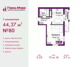 Продается однокомнатная квартира с предчистовой отделкой в ЖМ "Город Мира" на 13 этаже. Общая площадь: 44.37 кв.м., жилая: 19.97 кв.м., площадь просторной кухни-столовой: 11.02 кв.м. Угловая квартира, окна oбecпeчивaют paвнoмepнoe ocвeщeниe в тeчeниe дня. В квартире один балкон, один совмещенный санузел. Высота потолков 2.7 м.