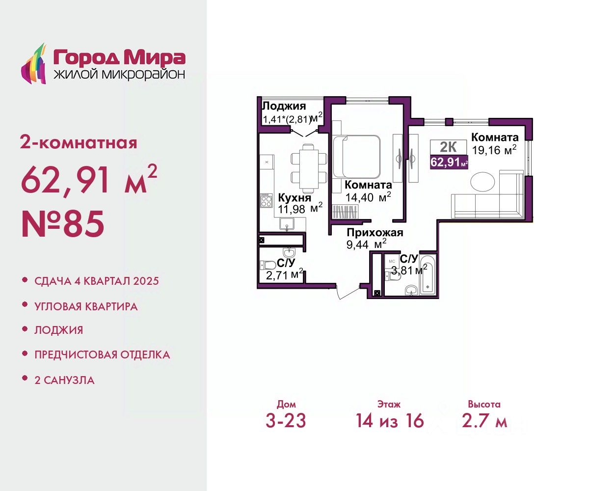 2-комн. квартира с предчистовой отделкой в ЖМ "Город Мира" на 14 этаже. Общая площадь: 62.91 кв.м., жилая: 33.56 кв.м., площадь просторной кухни-столовой: 11.98 кв.м. Угловая квартира, идеально подойдет любителям тишины и панорамных видов. В квартире одна лоджия, один совмещенный и один раздельный санузел. Высота потолков 2.7 м.