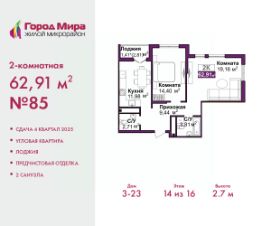 2-комн. квартира с предчистовой отделкой в ЖМ "Город Мира" на 14 этаже. Общая площадь: 62.91 кв.м., жилая: 33.56 кв.м., площадь просторной кухни-столовой: 11.98 кв.м. Квартира угловая, идеально подойдет любителям тишины и панорамных видов. В квартире одна лоджия, один совмещенный и один раздельный санузел. Высота потолков 2.7 м.