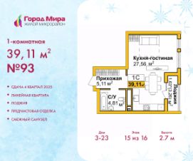 Продается 1-комн. квартира с предчистовой отделкой в ЖМ "Город Мира" на 15 этаже. Общая площадь: 39.11 кв.м., жилая: 22.56 кв.м., площадь кухни: 5 кв.м. Все окна выходят на одну сторону. В квартире одна лоджия, один совмещенный санузел. Высота потолков 2.7 м.