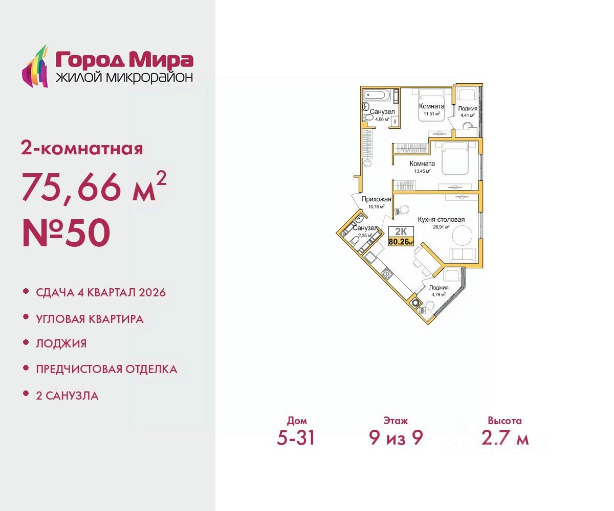 Просторная двухкомнатная квартира с предчистовой отделкой в ЖМ "Город Мира" на 9 этаже. Общая площадь: 75.66 кв.м., жилая: 24.96 кв.м., площадь просторной кухни-столовой: 28.91 кв.м. Квартира угловая, окна oбecпeчивaют paвнoмepнoe ocвeщeниe в тeчeниe дня. В квартире две лоджии, один совмещенный и один раздельный санузел. Высота потолков 2.7 м.